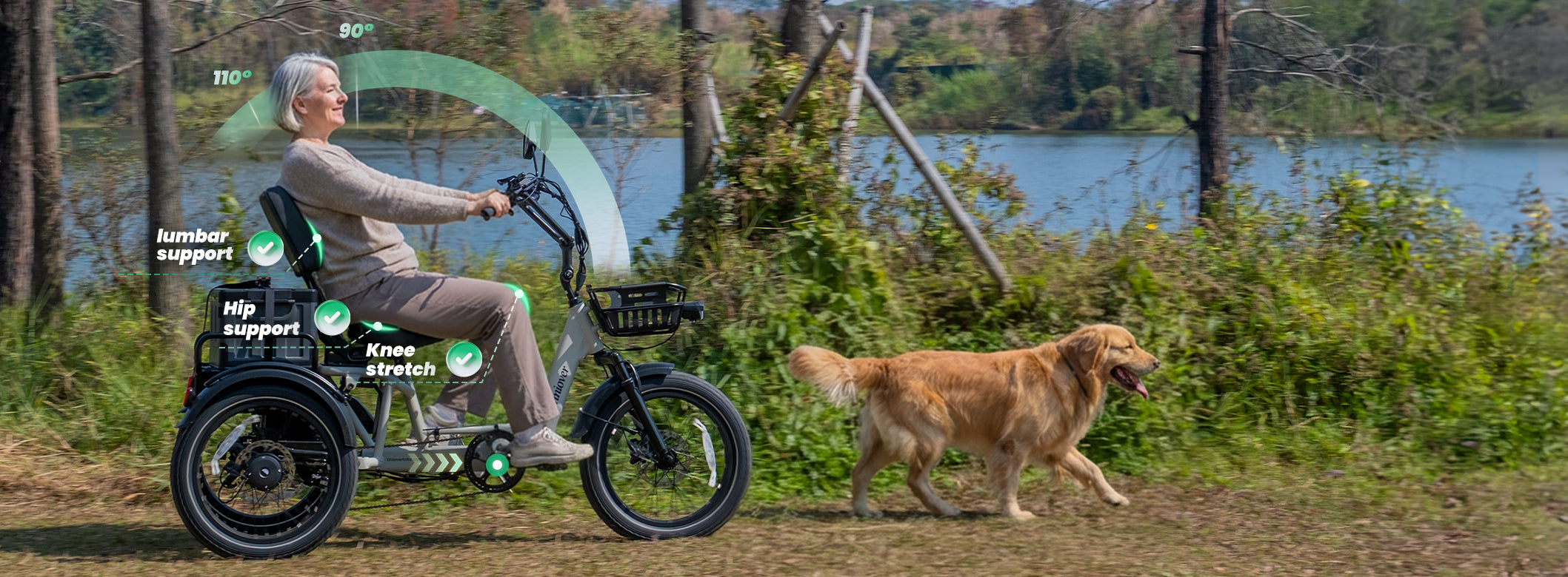 The full suspension of River electric trike is engineered to isolate the rider from road shock and constant micro-vibration, transforming road chatter into a smoother, more controlled glide. Maximizes stability, turning rough pavement, cracked sidewalks, curb cuts, and uneven paths into a easier and agile riding, making every trip more enjoyable.
